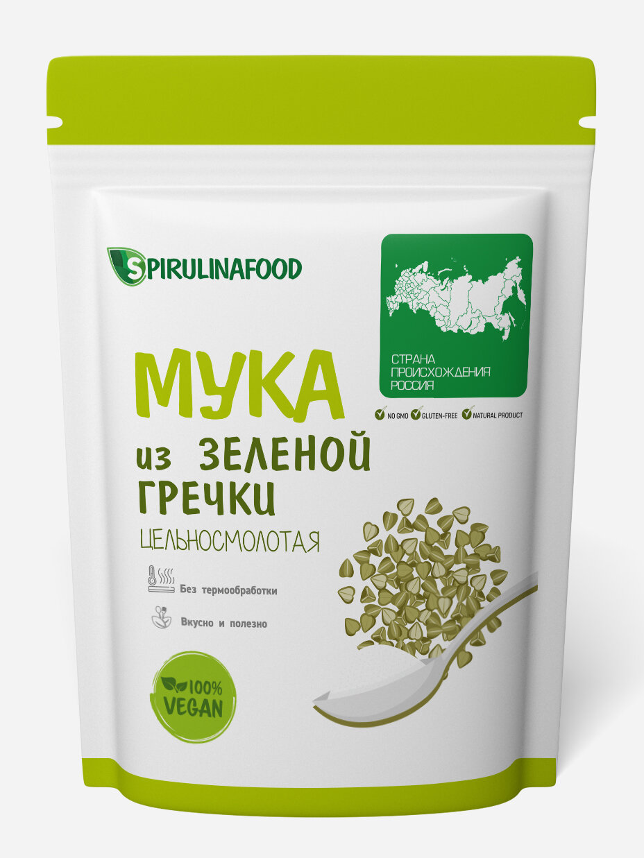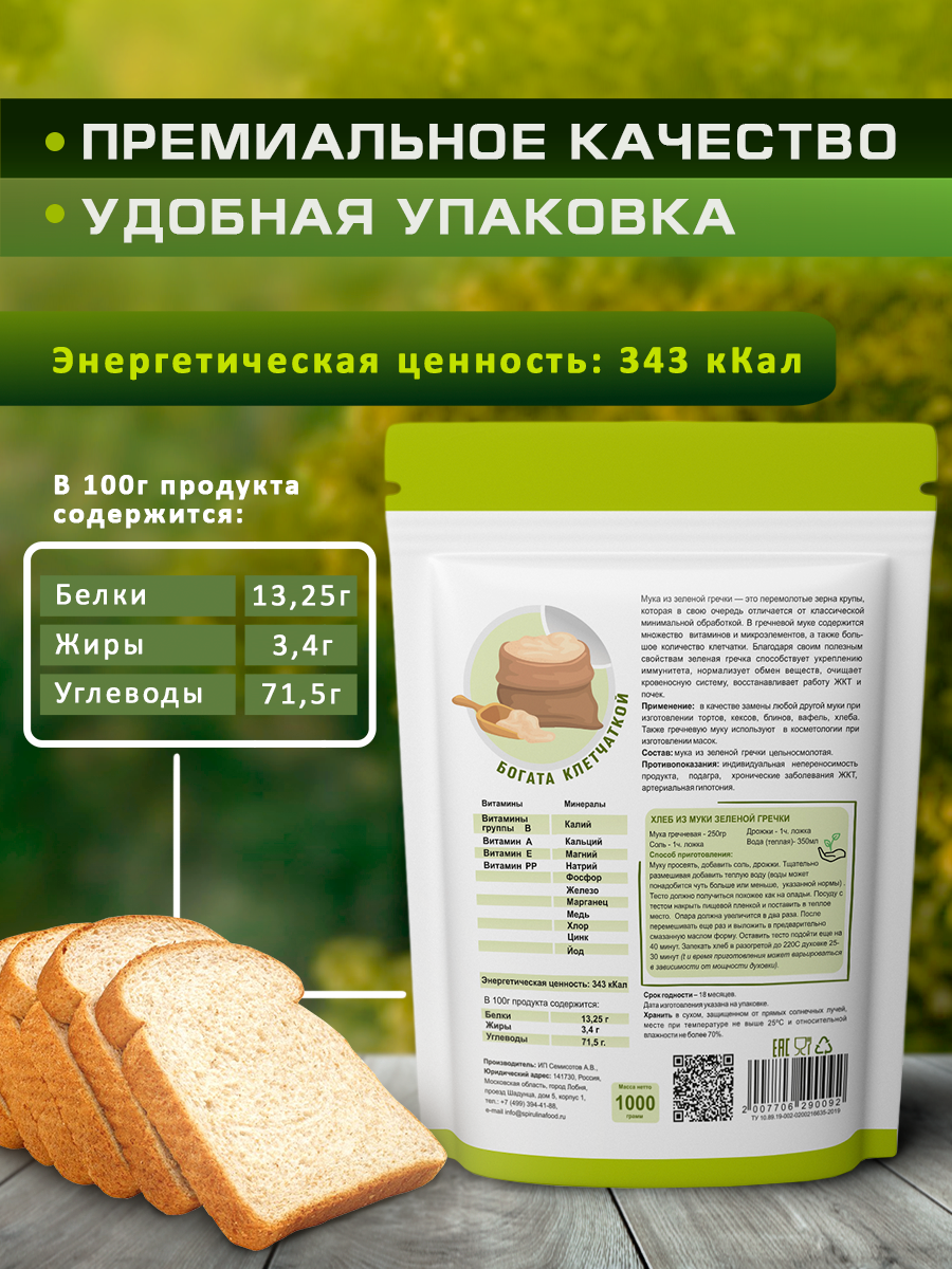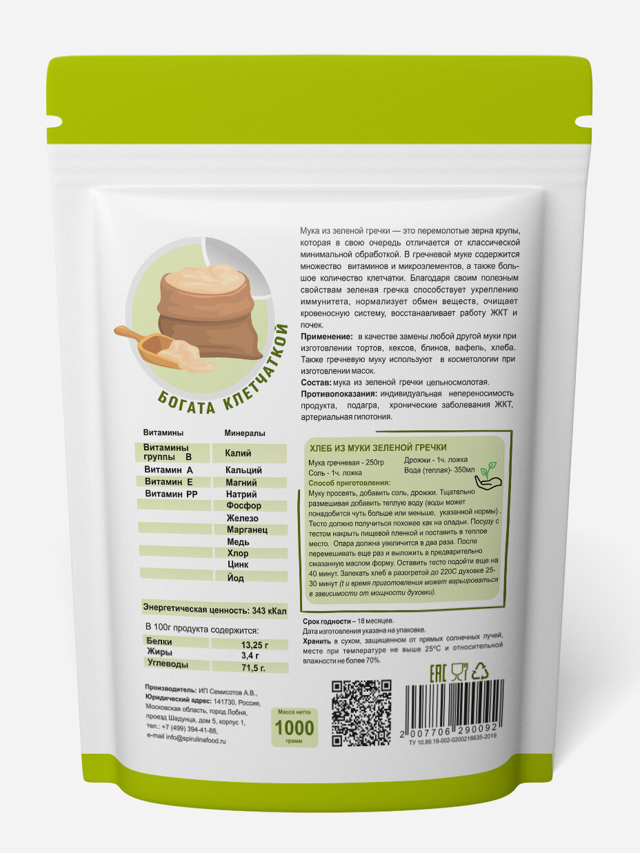 | Состав | мука цельнозерновая зеленой гречки. Не содержит ГМО. Диетический продукт. |
