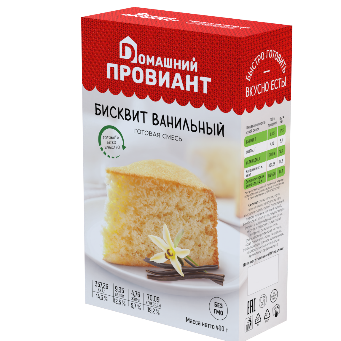 | Состав | Сахар-песок, мука пшеничная хлебопекарная высшего сорта, сухой глюкозный сироп, меланж яичный сухой, бамбуковая клетчатка, эмульгаторы (моно- и диглицериды жирных кислот, стеароил-2-лактилат натрия), разрыхлитель (дигидропирофосфат натрия, сода пищевая), соль пищевая, стабилизаторы (камедь ксантановая, карбоксиметилцеллюлоза ), ароматизатор (ванилин). |