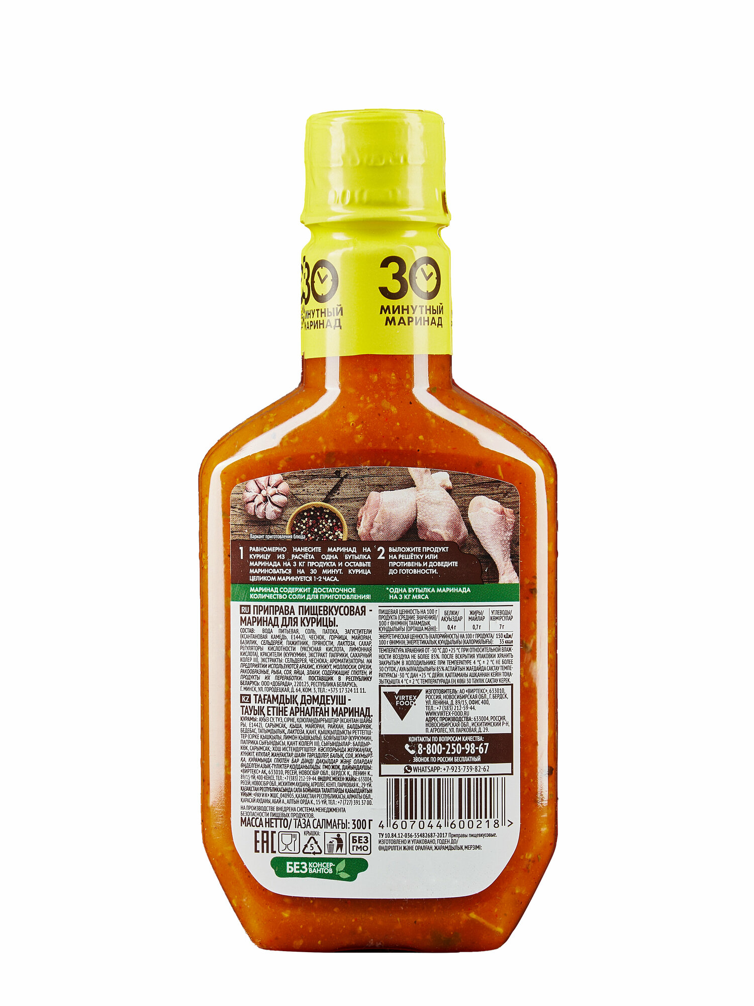 | Способ приготовления | Способ приготовления указан на обратной стороне бутылки: 1. Разделанную на части курицу равномерно обмазать маринадом из расчета: одна бутылочка на 3 кг птицы, и оставить на 30 минут (курица целиком маринуется 1-2 часа) для маринования. 2. Выложите продукт на решетку, противень или хорошо разогретую сковороду и доведите до готовности. |