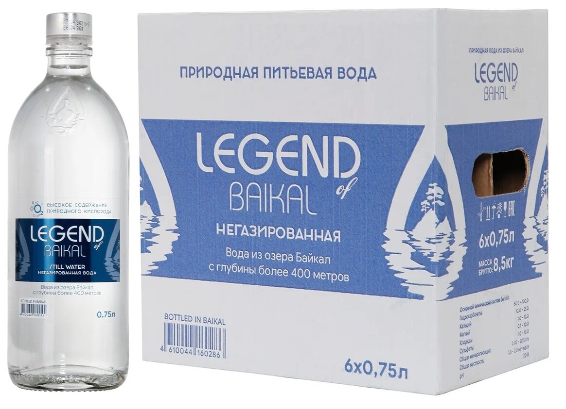 Вода питьевая Legend of Baikal (Легенда Байкала), 0,75 л х 6 бутылок, негазированная, стекло