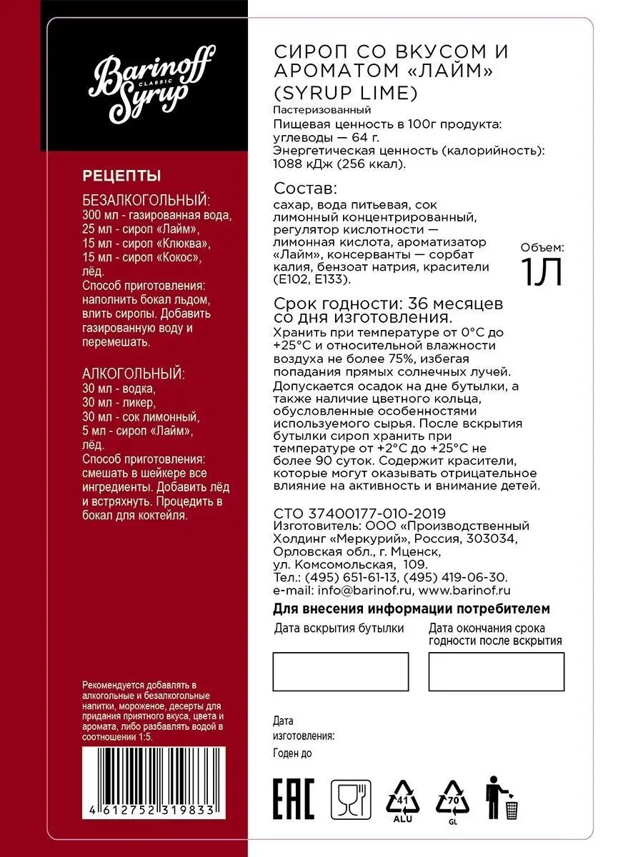 Сироп БАРinoff «Лайм», 1 л интересное: