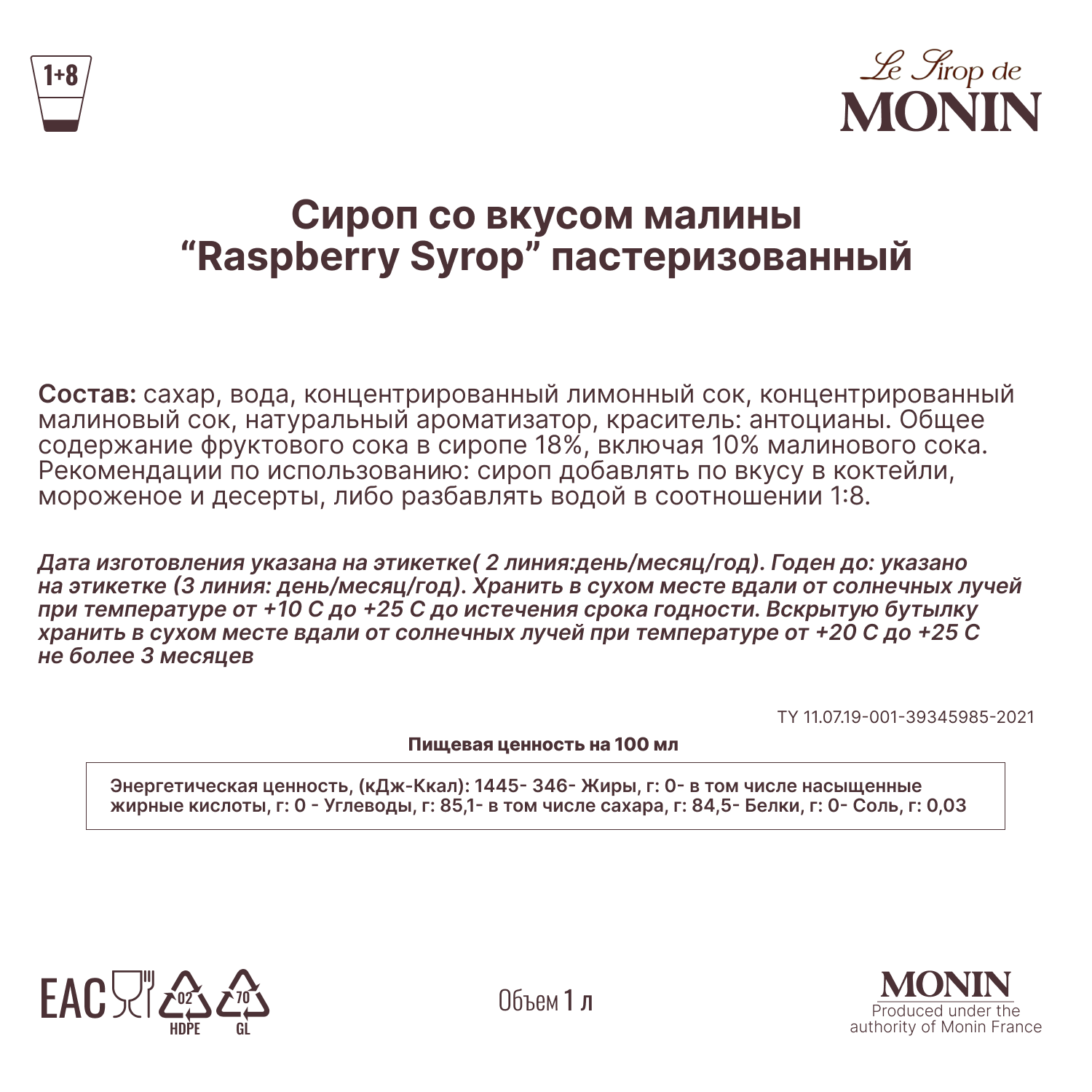 | Дополнительная информация | рекомендации по использованию: сироп добавлять по вкусу в коктейли, мороженное и десерты, либо разбавлять водой в соотношении 1:5; хранить в сухом, прохладном, защищенном от света месте при температуре 20-25С до истечения срока годности. вскрытую бутылку хранить в сухом, прохладном, защищенном от света месте при температуре 20-25С не более 2 месяцев |