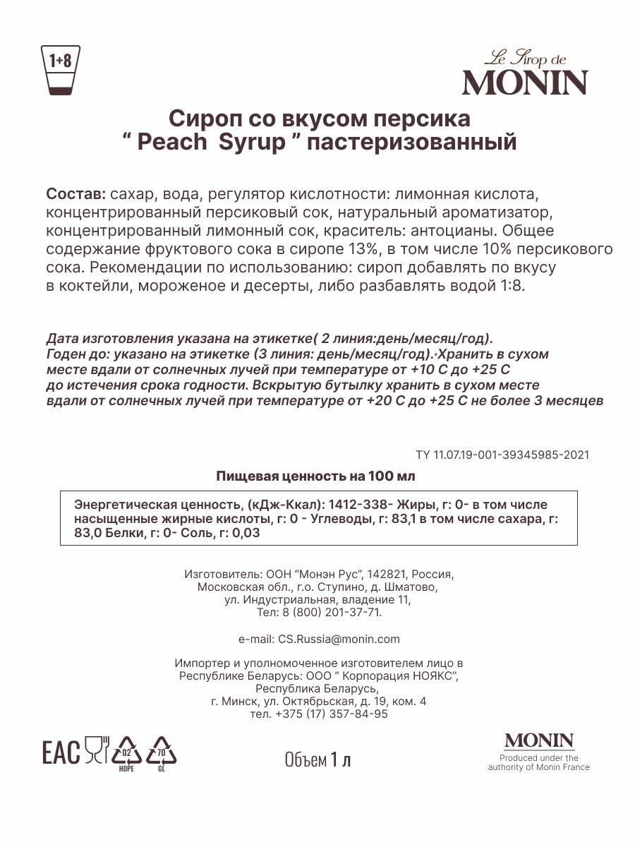 | Дополнительная информация | рекомендации по использованию: сироп добавлять по вкусу в коктейли, мороженное и десерты, либо разбавлять водой в соотношении 1:5; хранить в сухом, прохладном, защищенном от света месте при температуре 20-25С до истечения срока годности. вскрытую бутылку хранить в сухом, прохладном, защищенном от света месте при температуре 20-25С не более 2 месяцев |