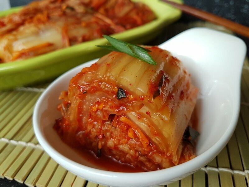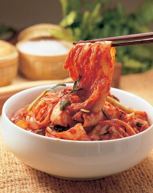 | Состав | Пекинская капуста (87,3%), редис дайкон, красный острый перец, сахар, соленые анчоусы (75% анчоусов, 25% соли), соленые креветки (80% креветок 20% соли), ракообразные, чеснок, лук-порей, имбирь, усилитель вкуса Е621. |