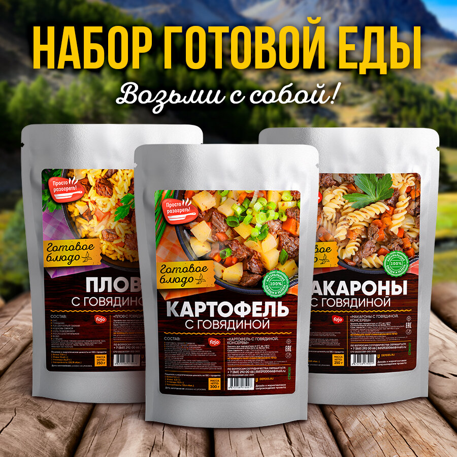 Сохранить7 вёрст Готовые блюда в фольге Набор 3 уп. (картофель, плов, макароны с говядиной) Консервы для походов, охоты, рыбалки интересное: