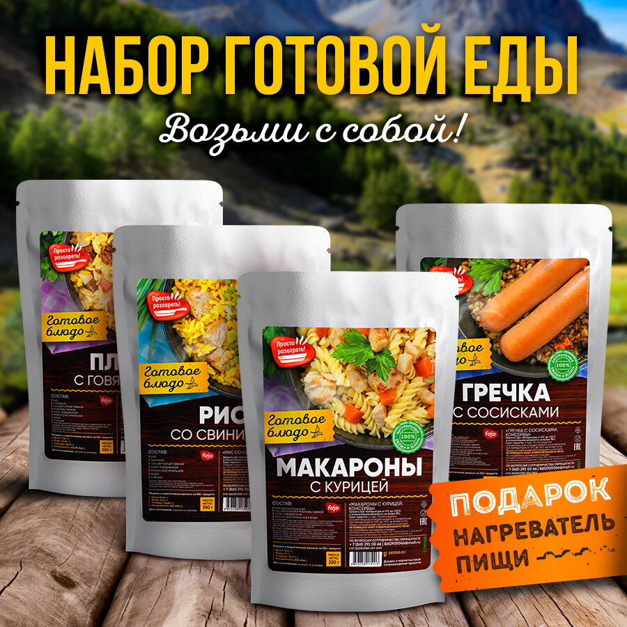 Сохранить7 вёрст Готовые блюда в фольге Набор 4 уп. + Подарок БНП 1 шт. (гречка с сосисками, плов с говядиной, рис со свининой, макароны с курицей) Консервы для походов, охоты, рыбалки интересное: