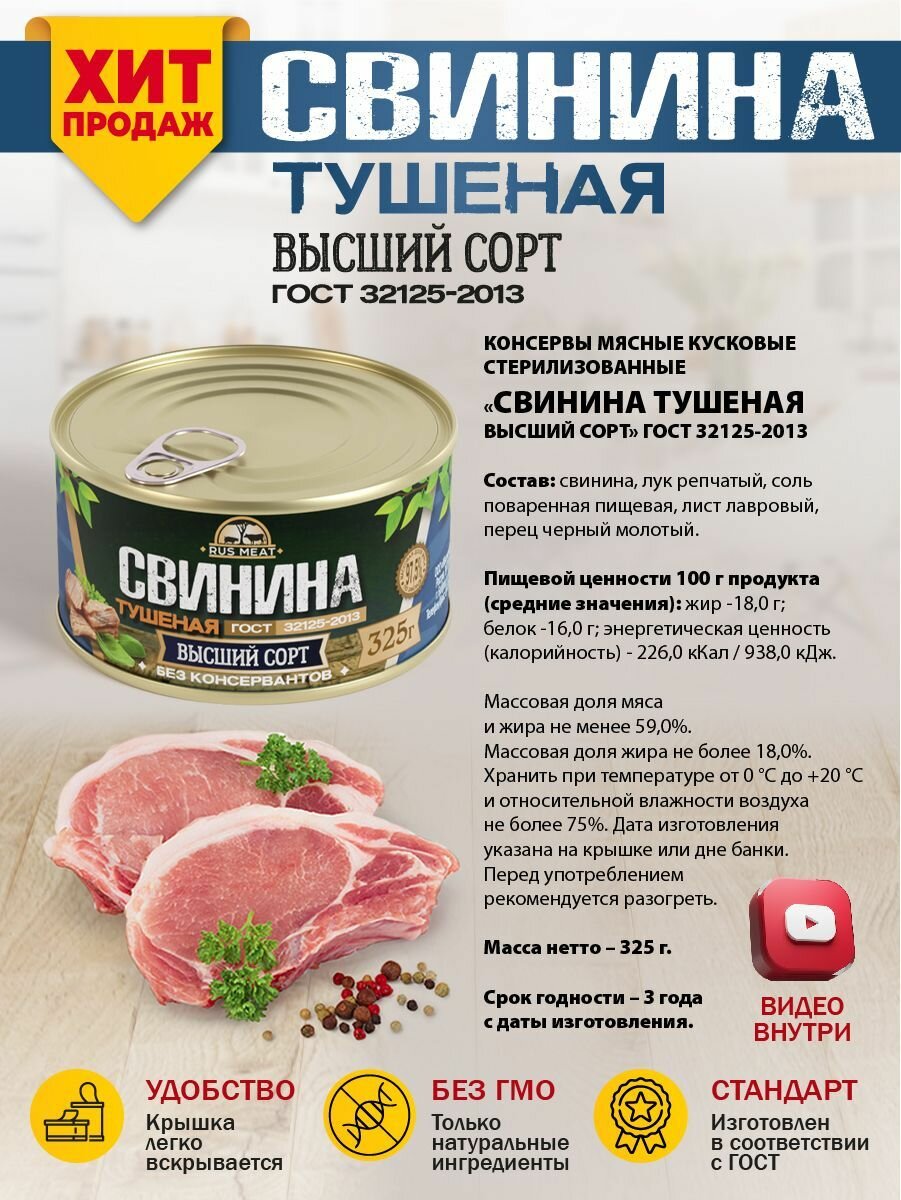 Свинина Тушеная Высший Сорт ГОСТ RusMeat 325 гр. - 4 шт. интересное: