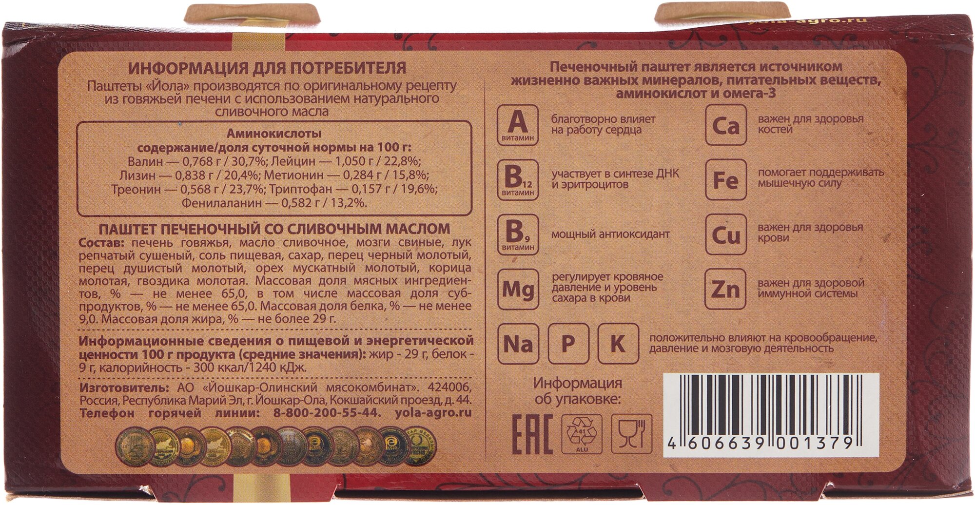 | Состав | Печень говяжья, масло сливочное, мозги свиные, лук репчатый сушёный, соль поваренная пищевая, сахар, перец чёрный молотый, перец душистый молотый, орех мускатный молотый, корица молотая, гвоздика молотая. |