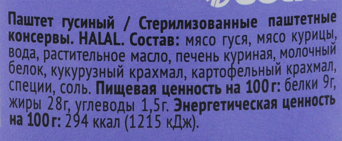 | Состав | мясо гуся, мясо курицы, вода, растительное масло, печень куриная, молочный белок, кукурузный крахмал, картофельный крахмал, специи, соль |
