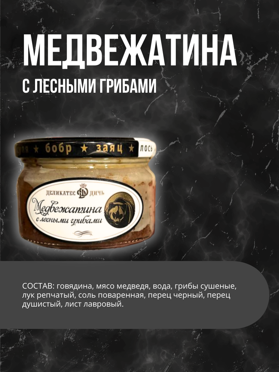 | Состав | говядина, мясо медведя, вода, грибы сушеные, лук репчатый, соль поваренная, перец черный, перец душистый, лист лавровый. |