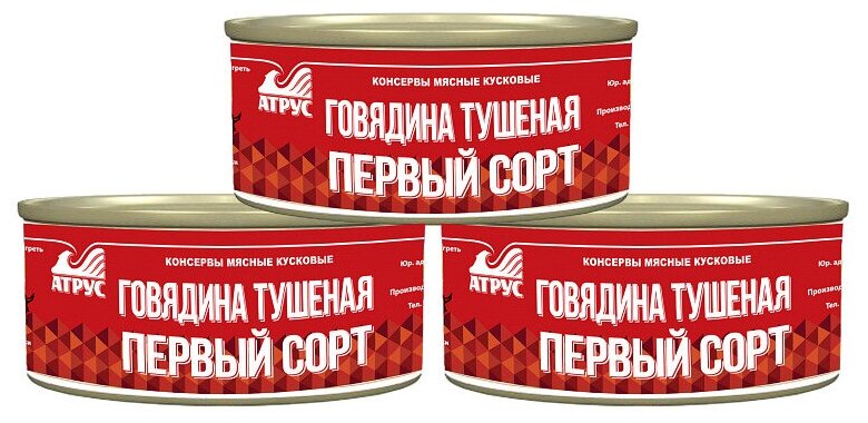 Атрус, Говядина тушеная первый сорт, ГОСТ, 325 г, упаковка 3 банки интересное: