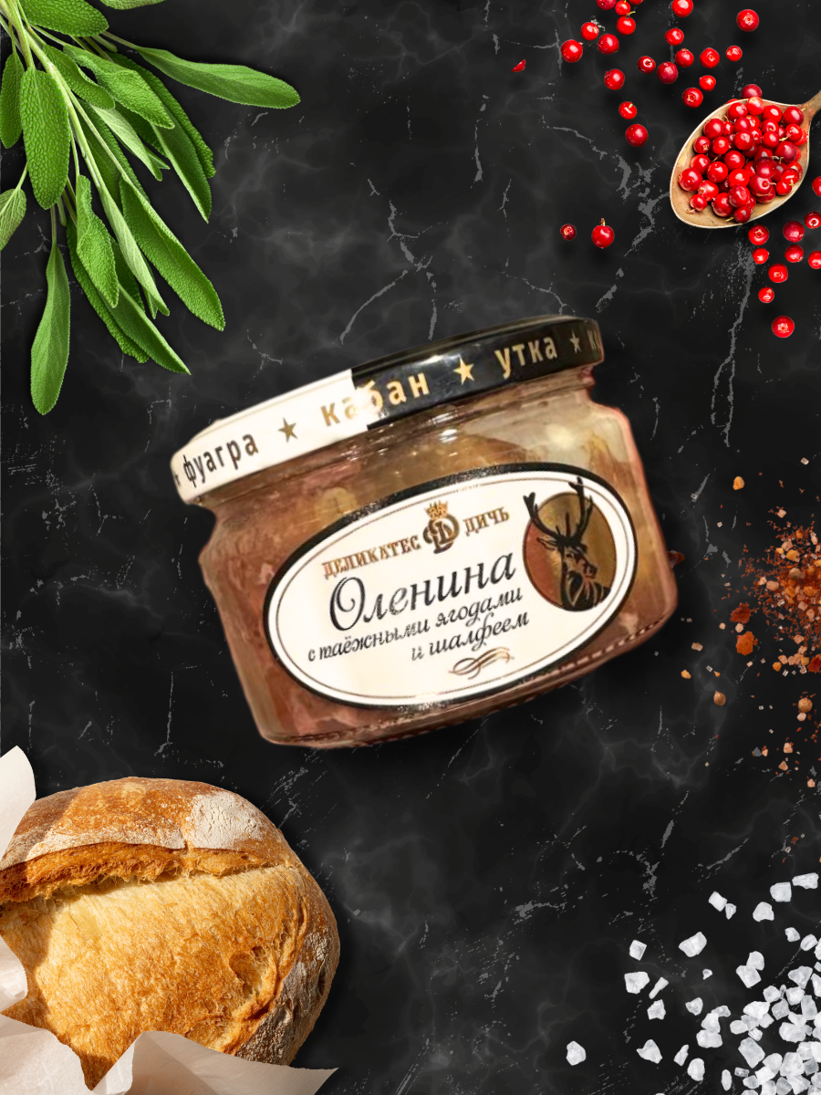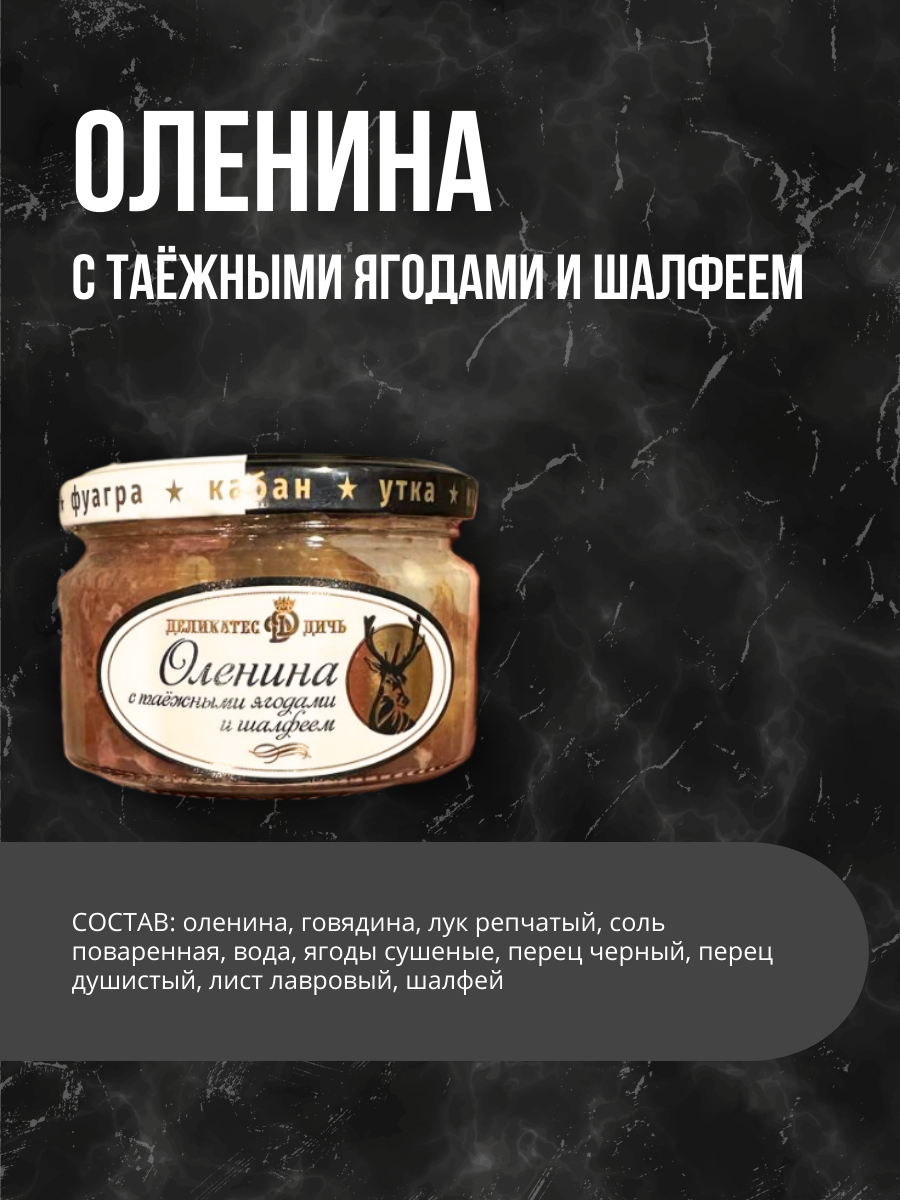 | Состав | оленина, говядина, лук репчатый, соль поваренная, вода, ягоды сушеные, перец черный, перец душистый, лист лавровый, шалфей |
