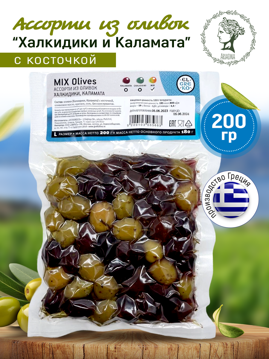 Купить Ассорти из оливок Каламата и Халкидики (L), Греция, вакуум, 200г
