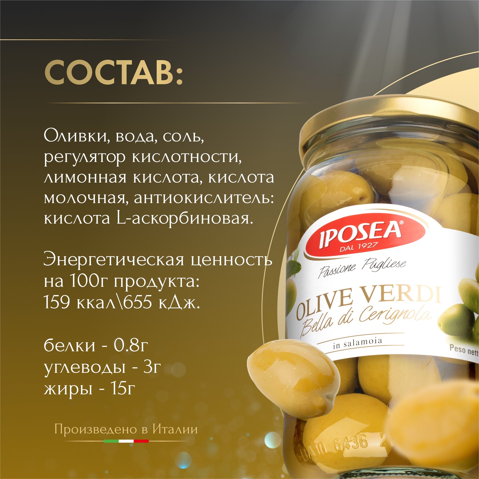 Оливки Iposea Белла ди Чериньола с косточкой 530 г стеклянная банка интересное: