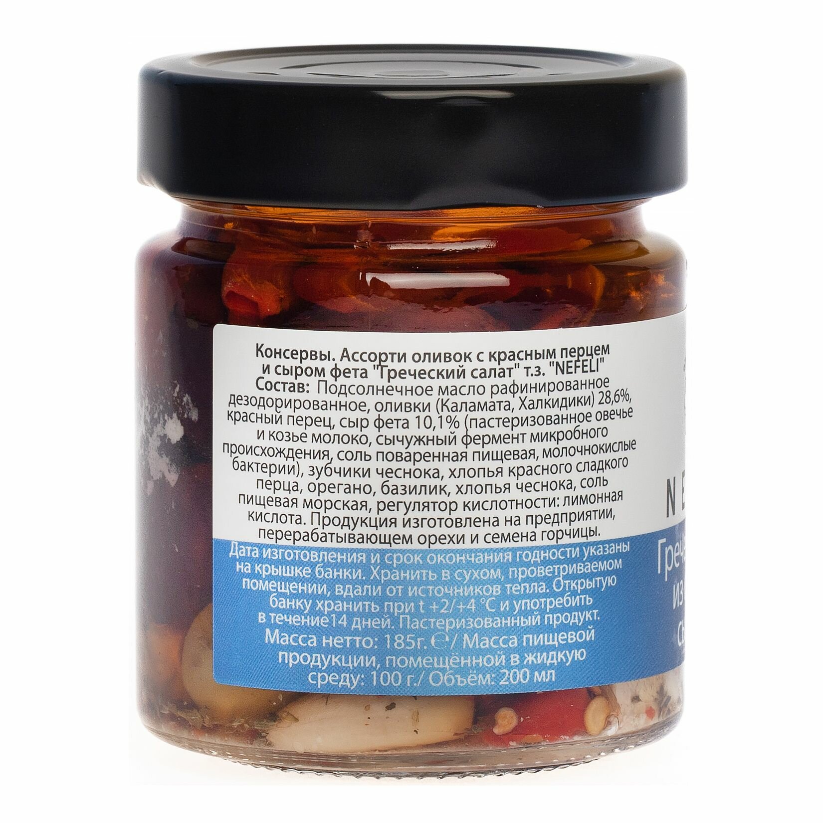 | Состав | Масло подсолнечное, оливки, перец красный, сыр фета, перец сладкий хлопьями, орегано, базилик, чеснок, соль морская, регулятор кислотности: кислота лимонная |