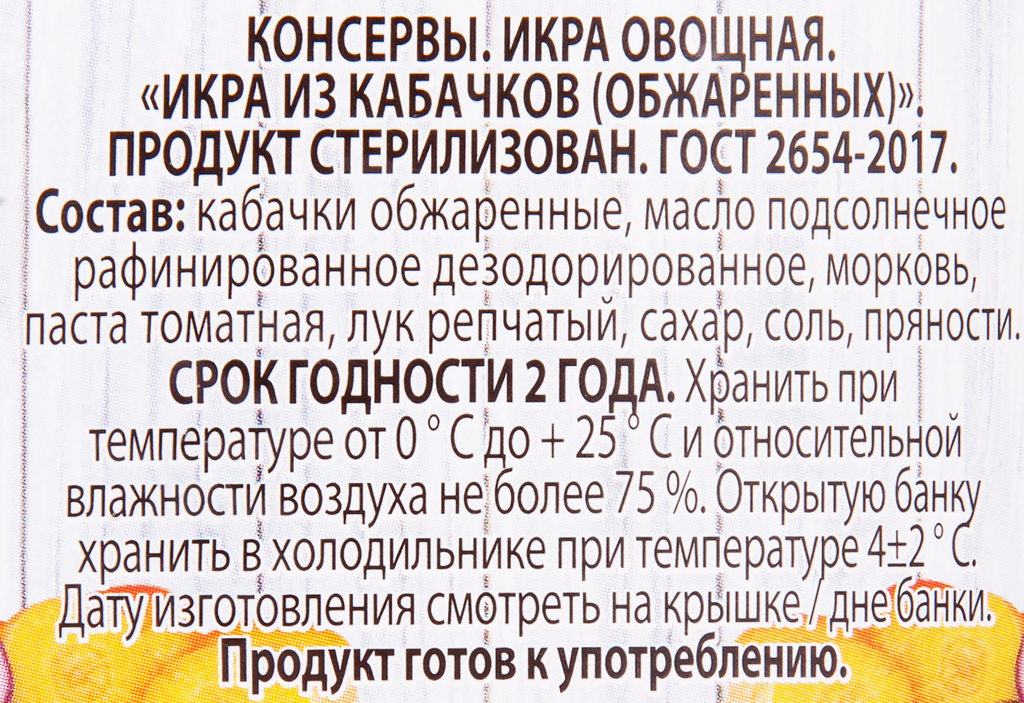 | Состав | кабачки обжаренные, лук репчатый, масло подсолнечное рафинированное дезодорированное, морковь, томатная паста, соль поваренная пищевая, сахар, пряности. |