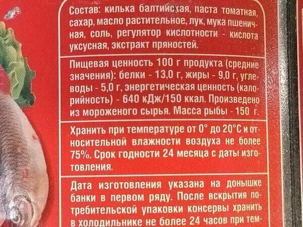 | Состав | килька балтийская, томатная паста, сахар, масло растительное, лук, мука пшеничная, соль, регулятор кислотности — кислота уксусная, экстракт пряностей. |
