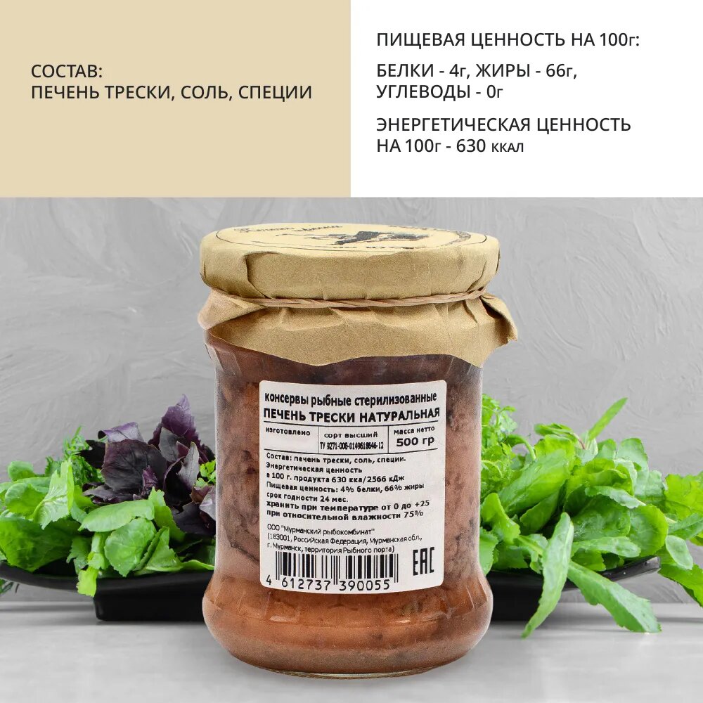 Печень трески атлантической натуральная Мурманск в собственном соку 500 гр стеклянная банка