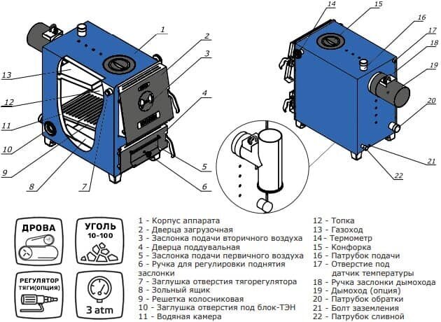| Топливо | древесные брикеты / дрова / уголь / угольные брикеты |