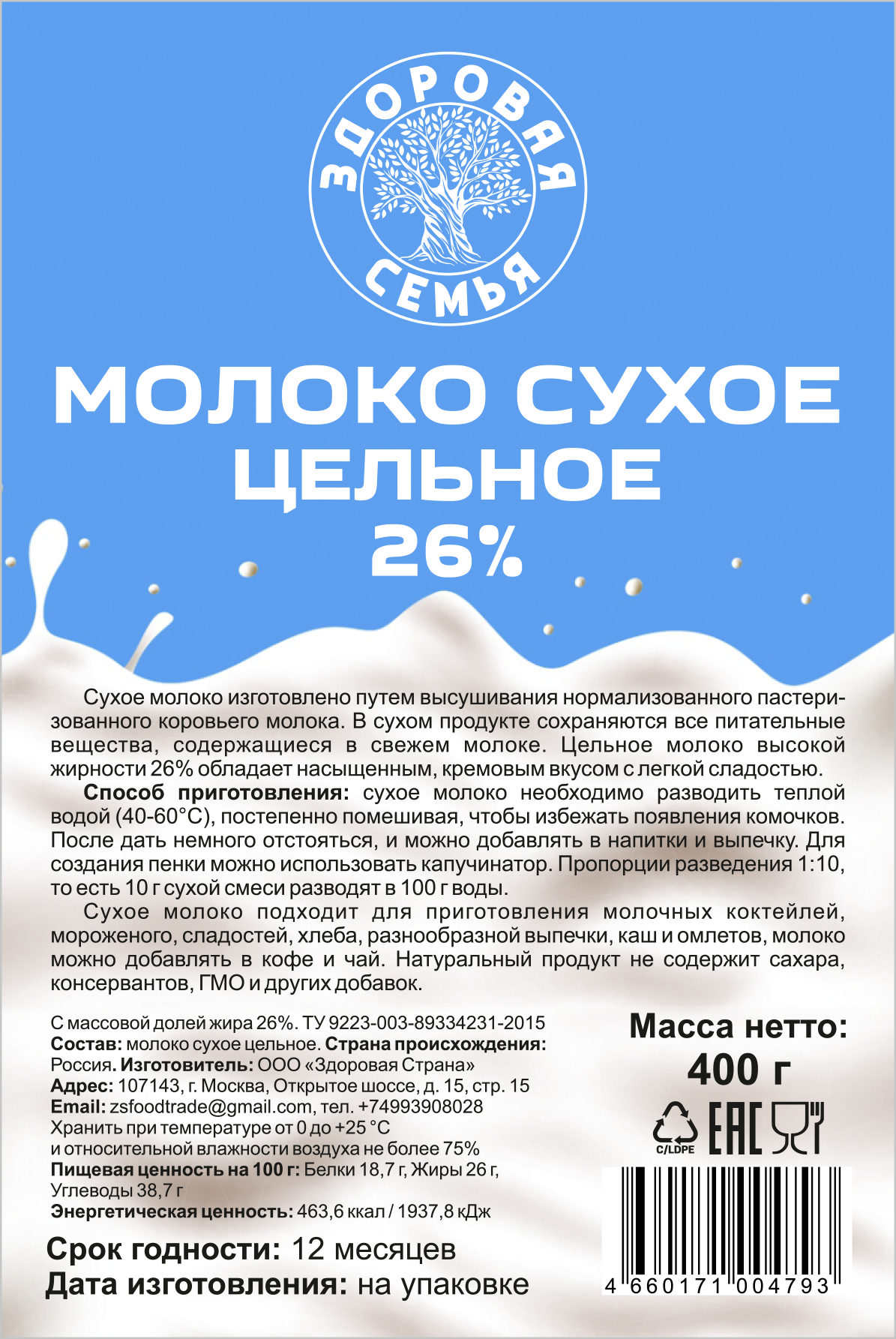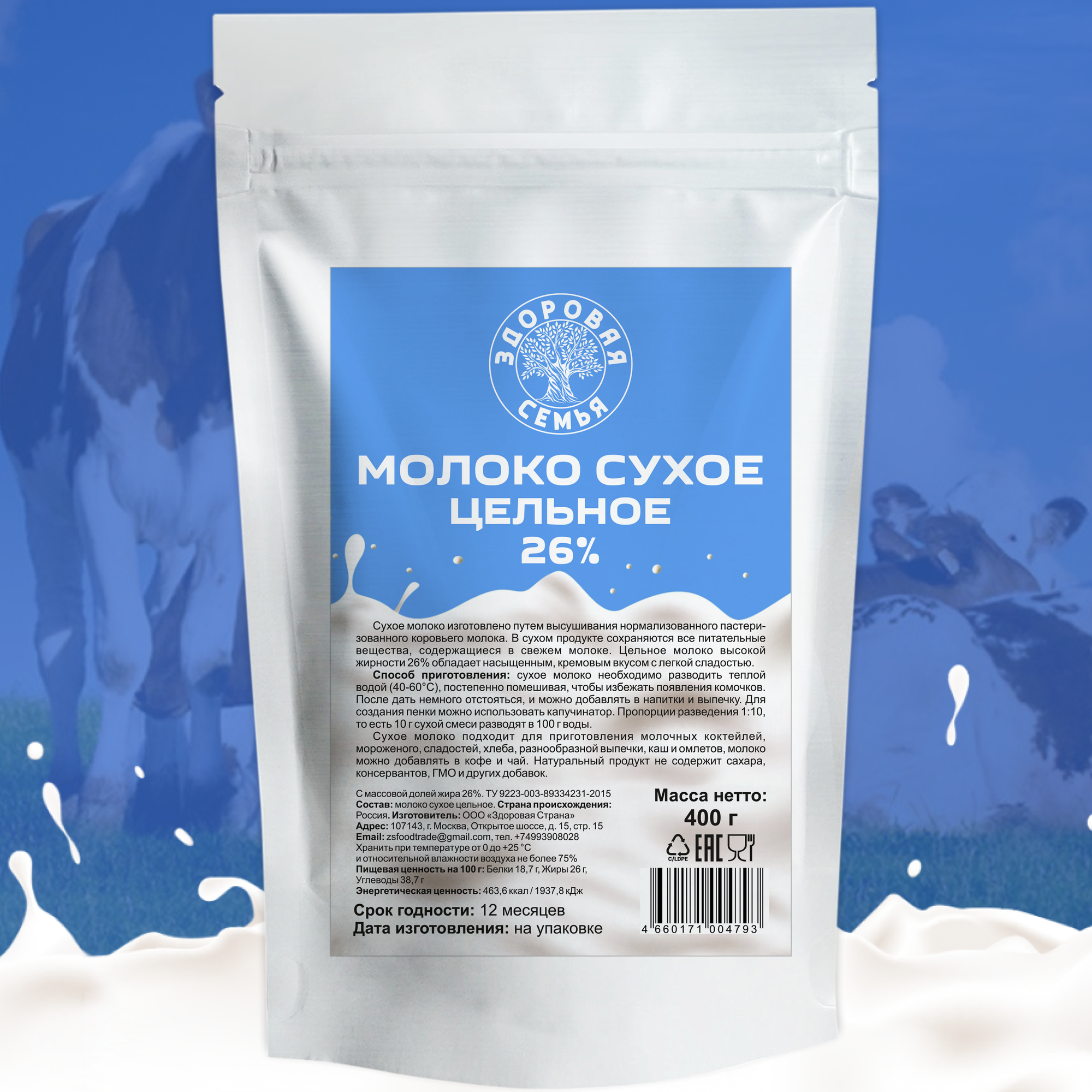 Молоко сухое Здоровая Семья цельное 26% ТУ, 400 г, натуральное, заменитель молока для чая, кофе и выпечки, без сахара