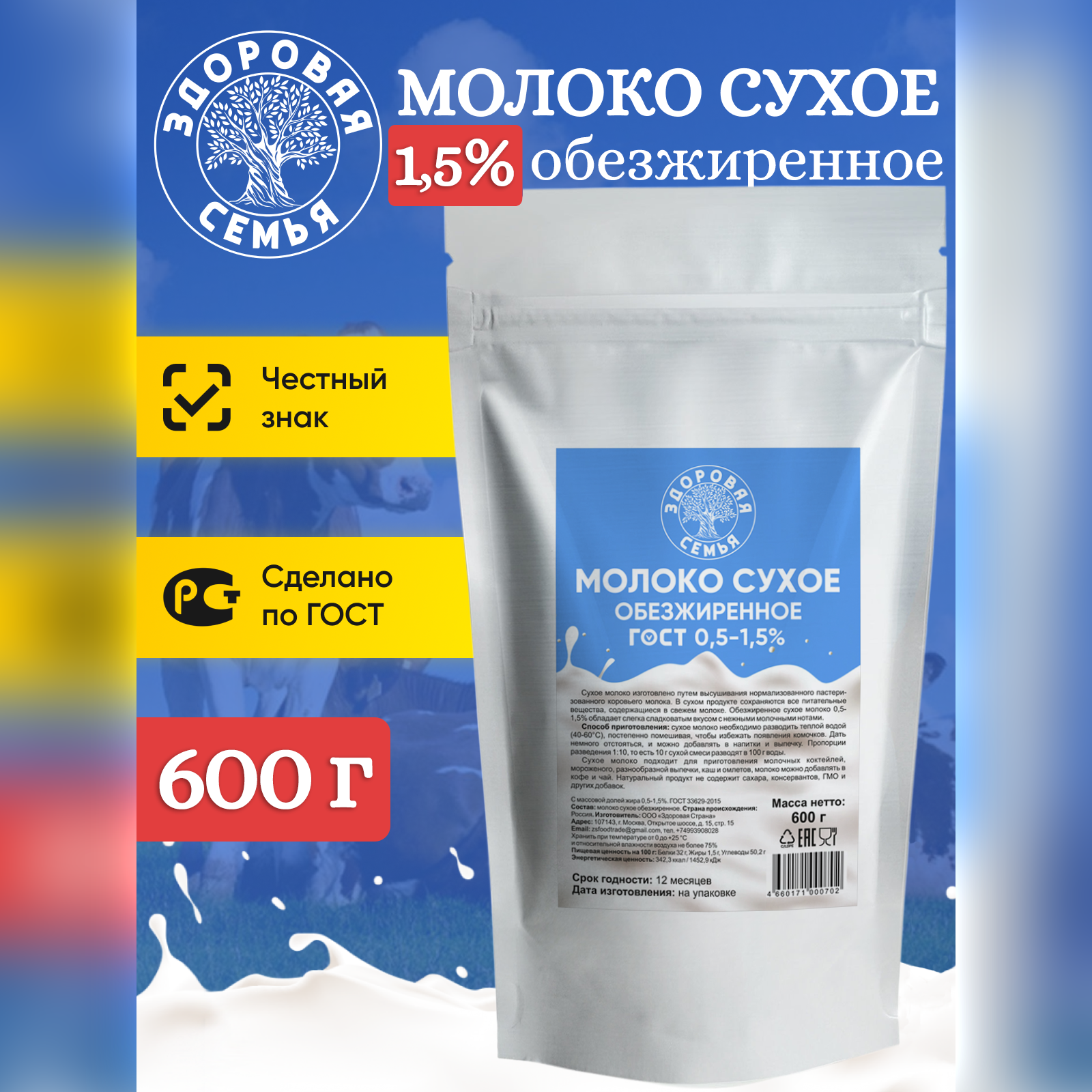 Молоко сухое Здоровая Семья обезжиренное 0.5-1.5% ГОСТ, 600 г, натуральное, заменитель молока для чая, кофе и выпечки, без сахара