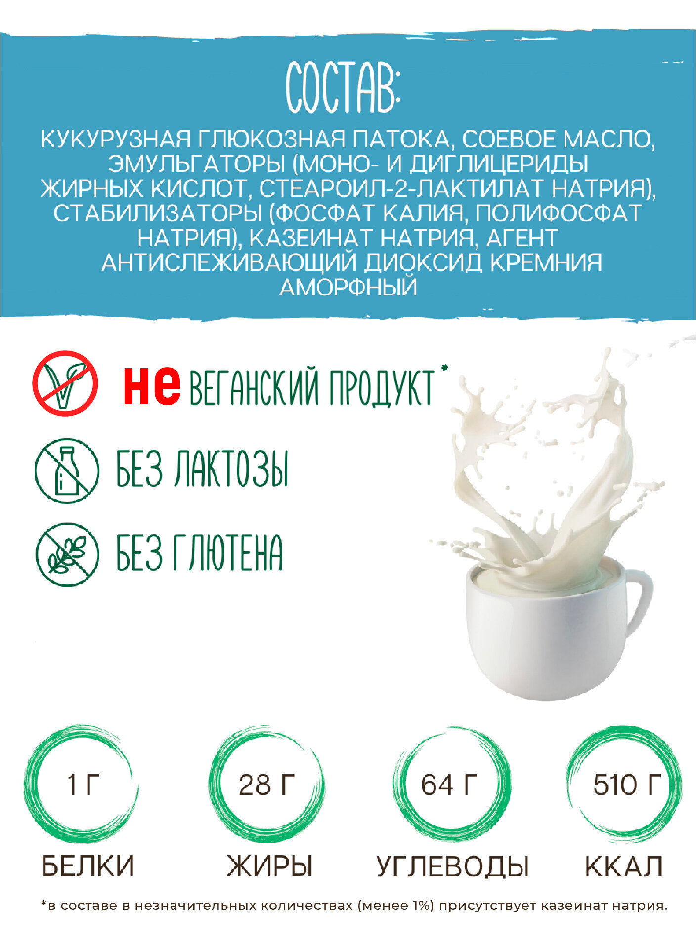 | Состав | соевое масло,казеинат натрия,агент антислеживающий диоксид кремния аморфный,патока кукурузная глюкозная,фосфат калия |