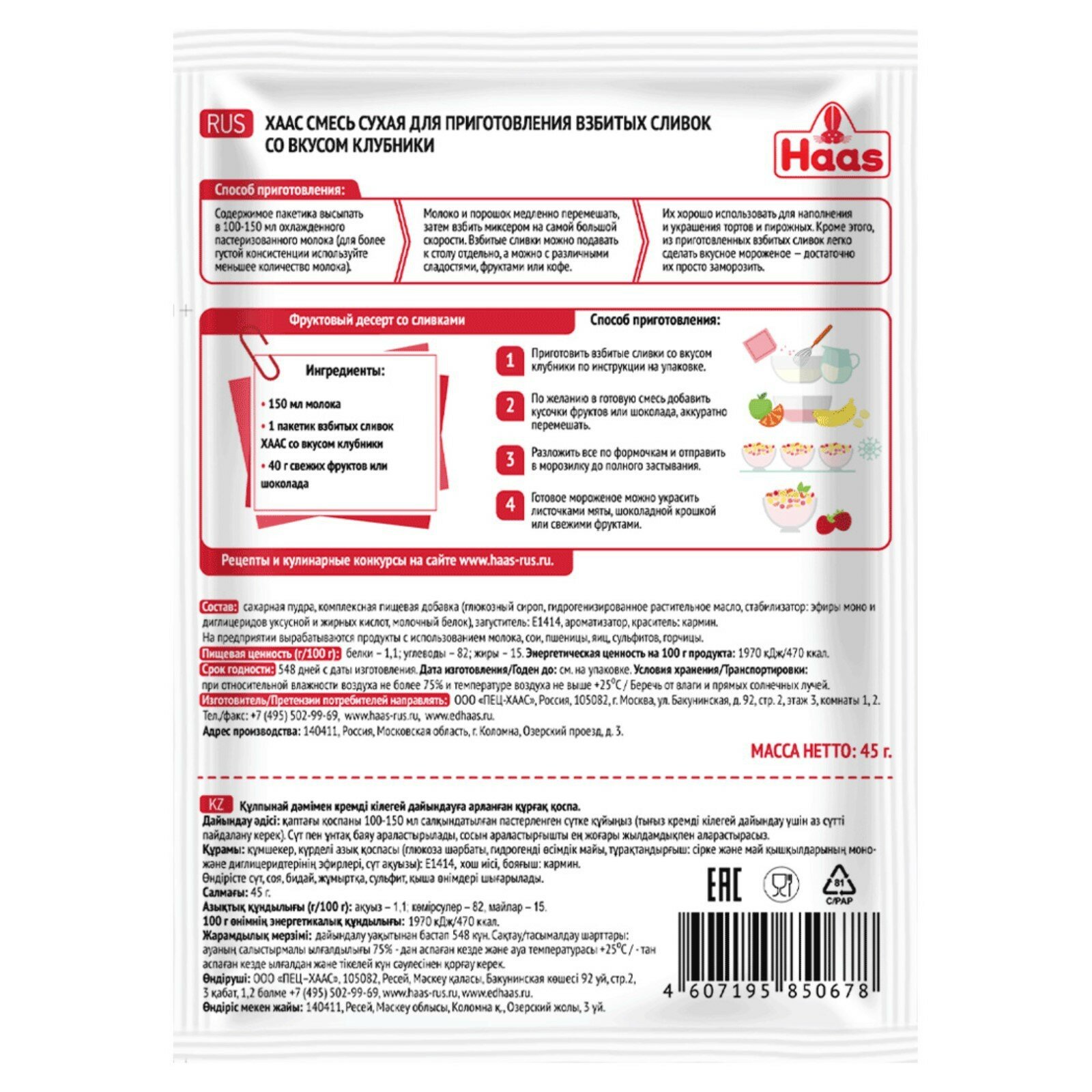 | Дополнительная информация | Легкий и быстрый способ приготовления - достаточно взбить 1 пакетик сухой смеси со 150 мл молока. 1 пакетик = около 500 мл готового продукта. Не оседают дольше, чем взбитые сливки в балончике. |