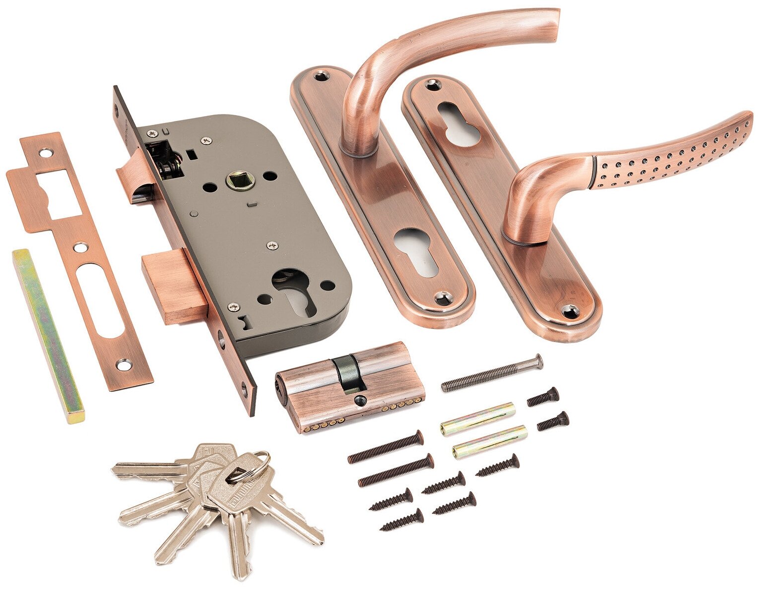 Купить Замок врезной дверной с ручками и цилиндром для деревянной двери аллюр 132/1 AC, цвет старая медь, 5 ключей