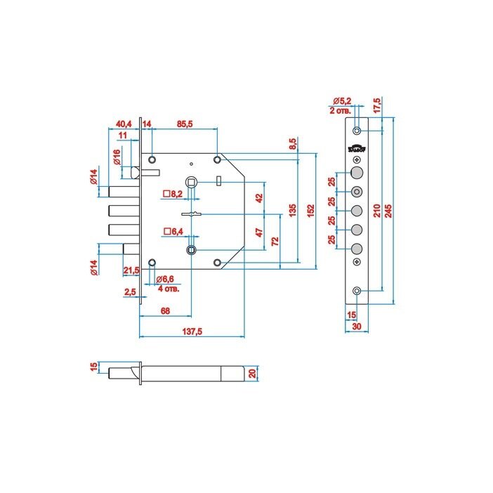 Замок врезной Эльбор 1.06.41 правый. Сувальдный, 3-х ригельный с защелкой и задвижкой