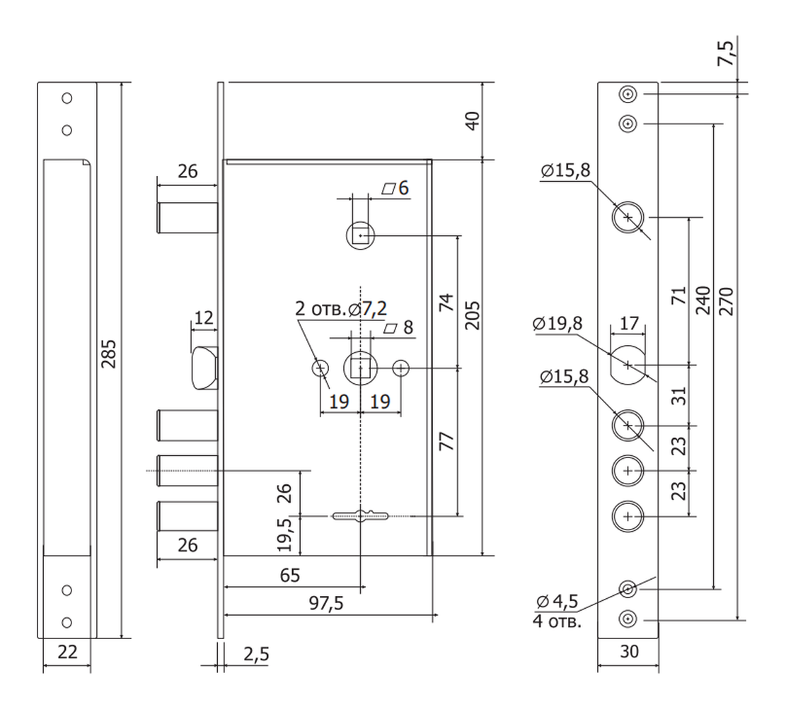 Замок врезной, с защелкой и задвижкой Гардиан 30.15