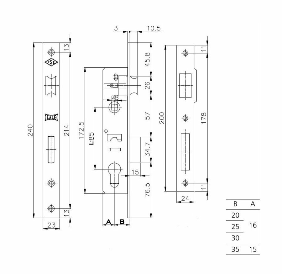 Корпус узкопрофильного замка с защёлкой Kale Kilit 153 (30 mm) w/b (никель)