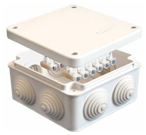 Купить Коробка распределительная ОП 105х105х56мм IP54 с клемм. 7 выходов 4 гермоввода 10А 12 контактов крышка на винтах бел. Epplast 110043