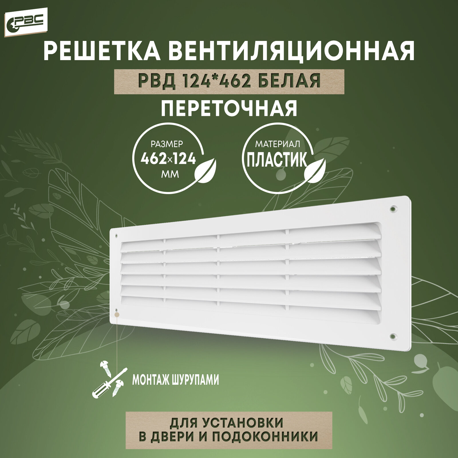 Решетка вентиляционная дверная приточно-вытяжная 124х462, пластик, белая, прямоугольная