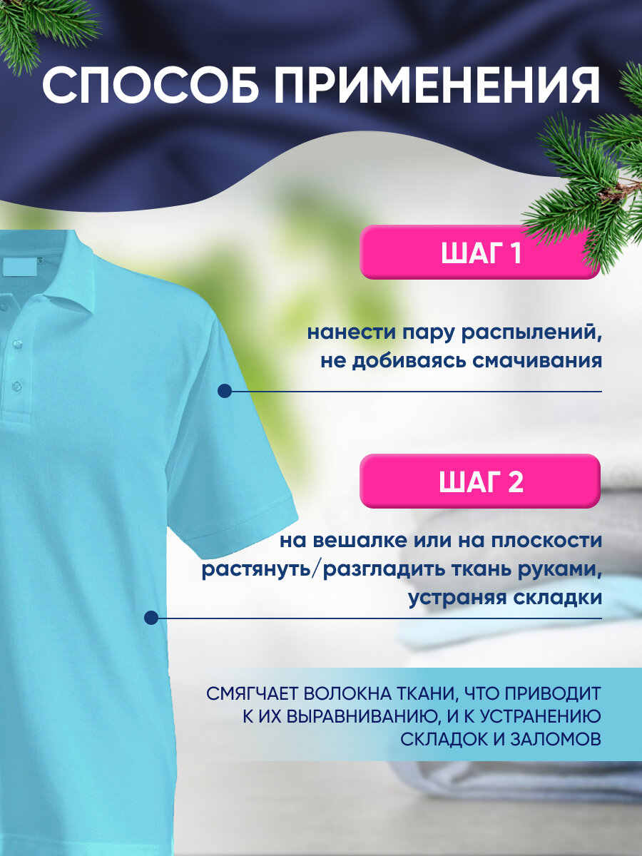 | Способ применения | 1. Встряхните хорошо перед использованием. 2. Разложите изделие на ровной поверхности и равномерно распылите средство сверху вниз на расстоянии 15-20 см. 3. Разгладьте складки руками легкими движениями. 4. Оставьте высыхать на 4-5 минут |