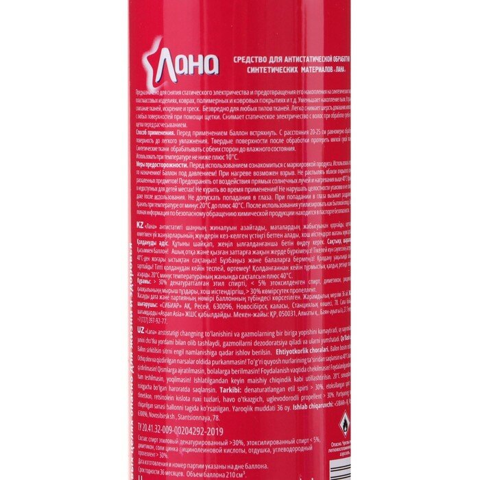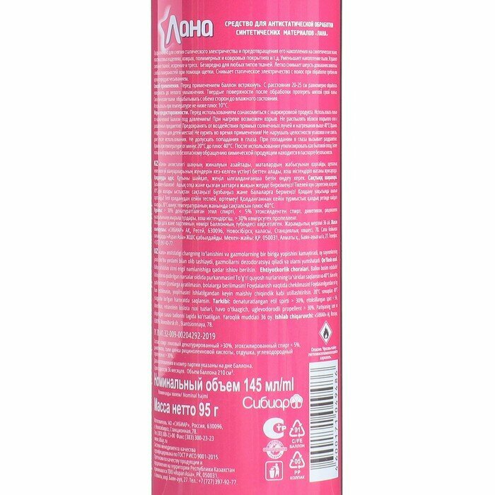 | Дополнительная информация | Продукт безопасен для использования на различных типах материалов, включая натуральные и синтетические ткани, не оставляя следов и не повреждая поверхности изделий. 5. Удобная флакон-распылитель позволяет равномерно распределить антистатик на поверхности и точно дозировать его использование, что делает его экономичным в использовании. Антистатик Лана 145мл розового цвета - это незаменимый товар для всех, кто хочет избавиться от неприятного статического эффекта на своей одежде. Будьте всегда уверены и комфортны благодаря этому эффективному и стильному решению. |
