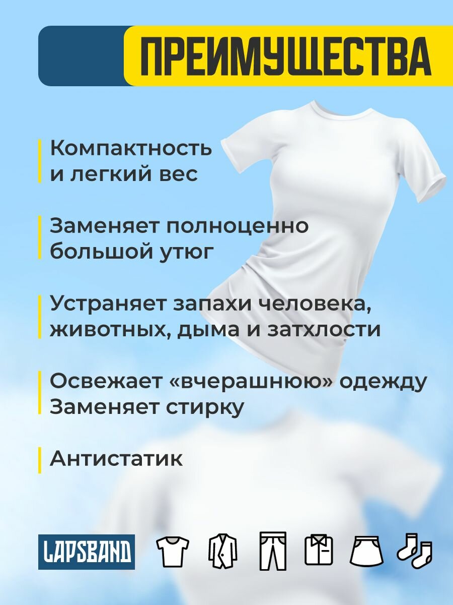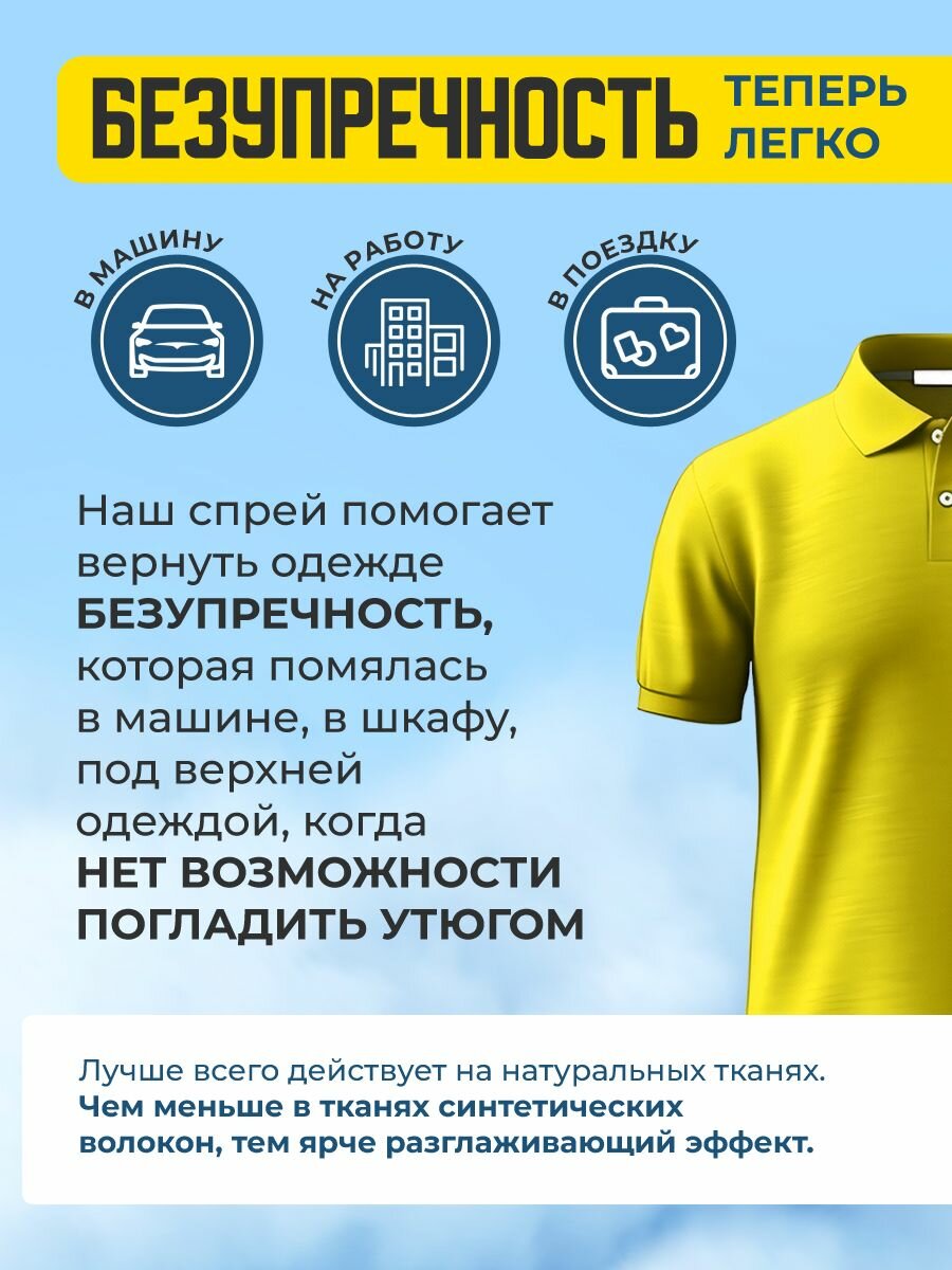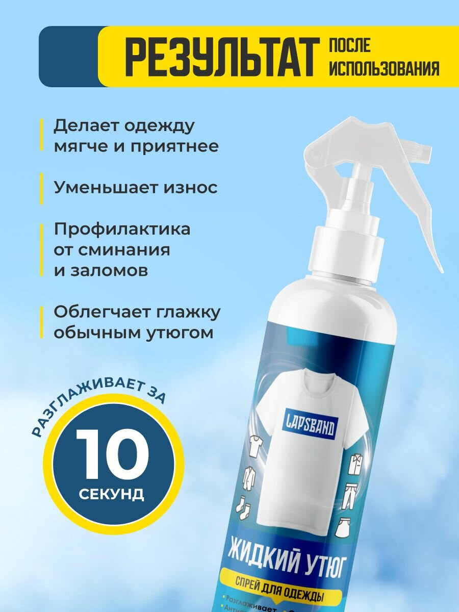 | Способ применения | 1. Встряхните перед использованием. 2. Разложите изделие на ровной поверхности и равномерно распылите средство сверху вниз на расстоянии 15-20 см. 3. Разгладьте складки руками легкими движениями. 4. Оставьте высыхать на 4-5 минут |