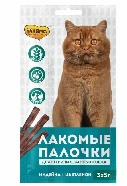 Купить Лакомство Мнямс лакомые палочки 13,5 см для стерилизованных кошек из индейки и цыпленка 10х5 г NEW