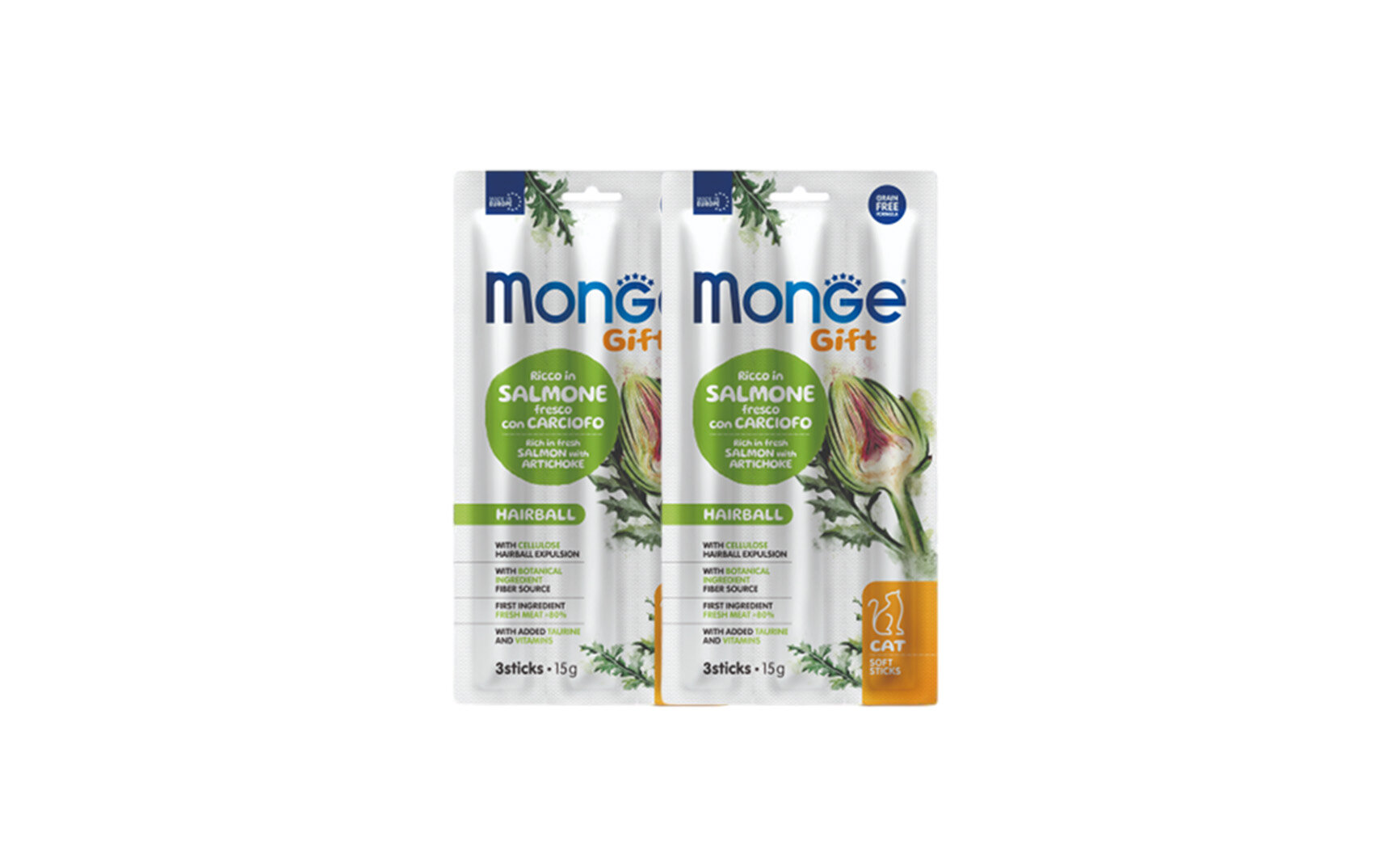 Лакомство 2 шт по 15 г Monge Gift Hairball для кошек "Мягкие палочки" с лососем и артишоком