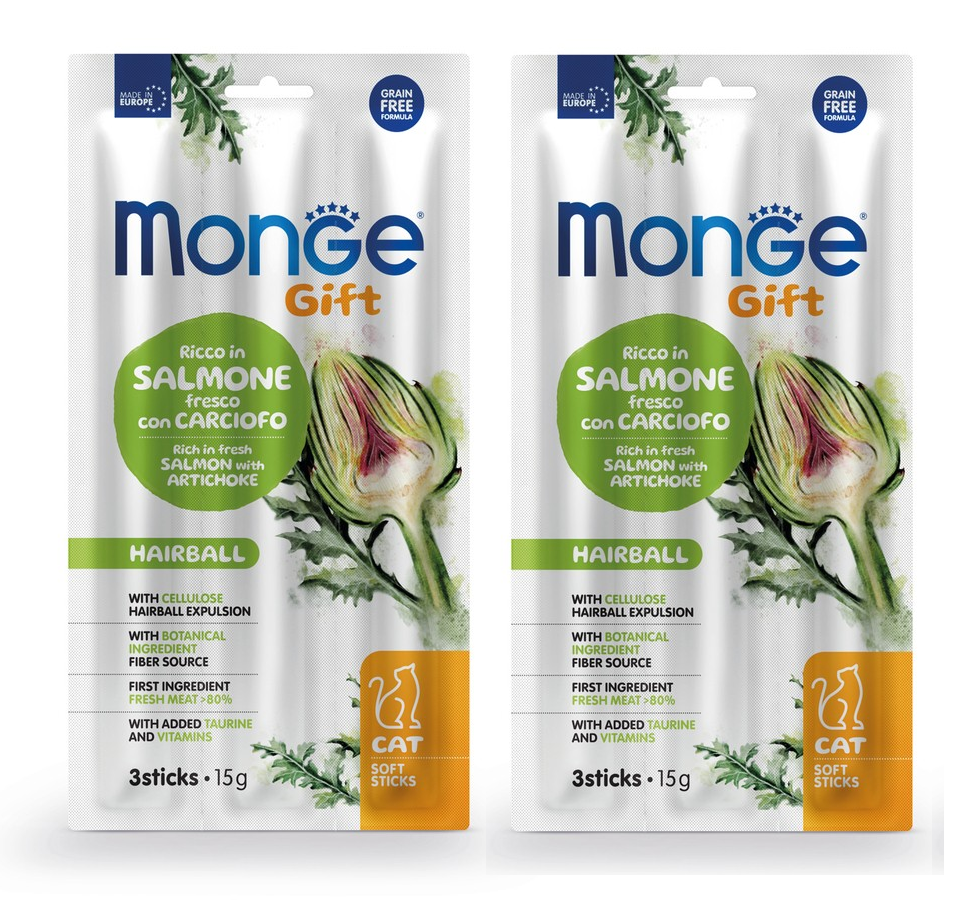 Купить Лакомство Monge Gift Hairball для кошек Мягкие палочки с лососем и артишоком для вывода шерсти 15 г 2 шт.