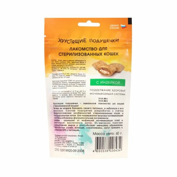 Лакомство для стерилизованных кошек TiTBiT Хрустящие подушечки с индейкой 60г интересное: