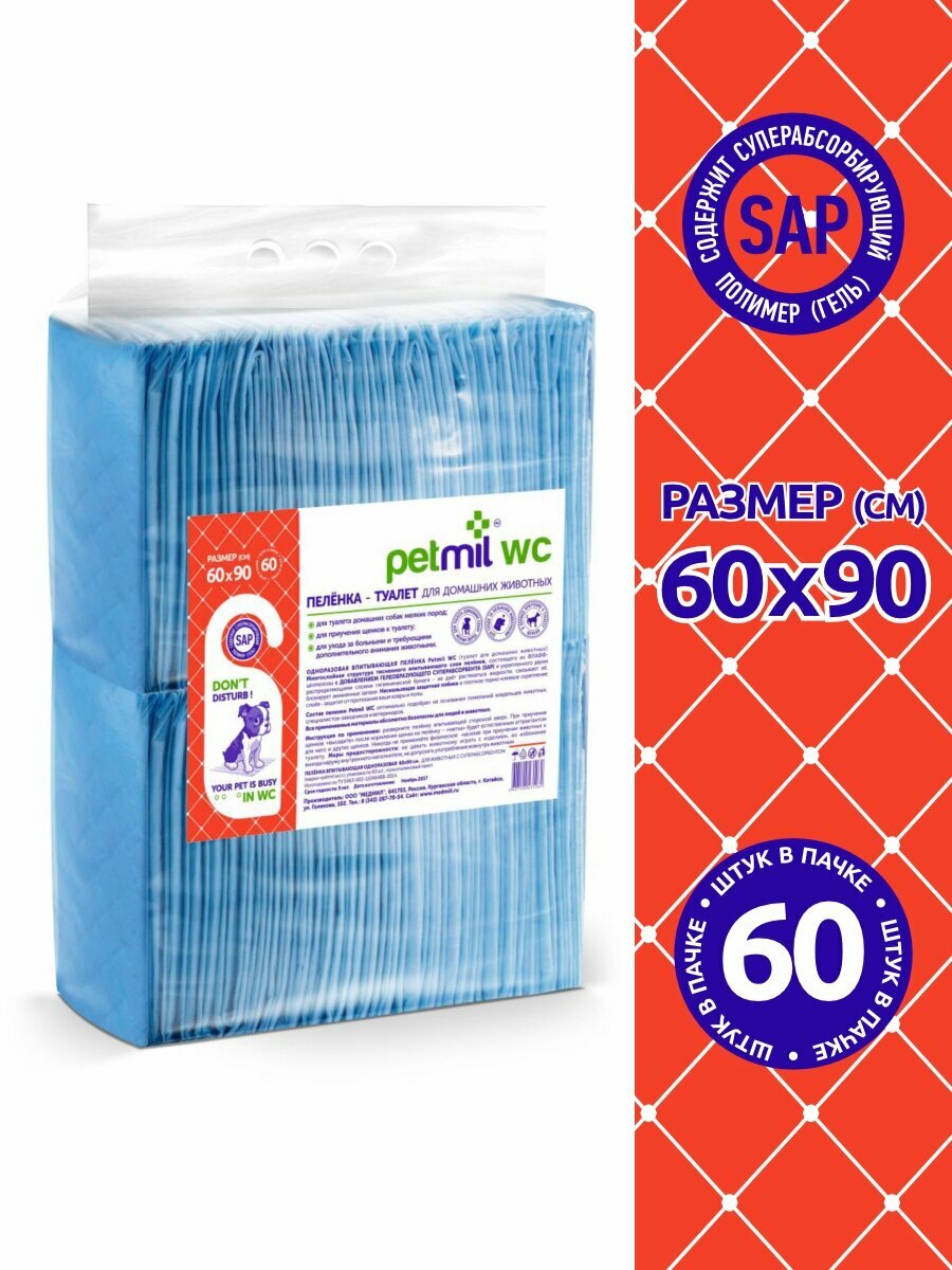 Купить Пеленка-туалет впитывающая одноразовая Petmil WC 60*90 для животных с суперабсорбентом (упаковка 60 штук)
