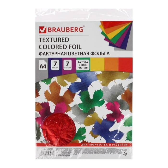 Купить Цветная фольга А4 фактурная, 7 листов, 7 цветов, "листья", BRAUBERG, 205х255 мм, 124743