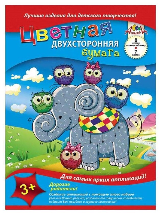 Бумага цветная двусторонняя Апплика "Слоненок и совушки" (8 листов, 7 цветов, А4) (С2785-01) интересное: