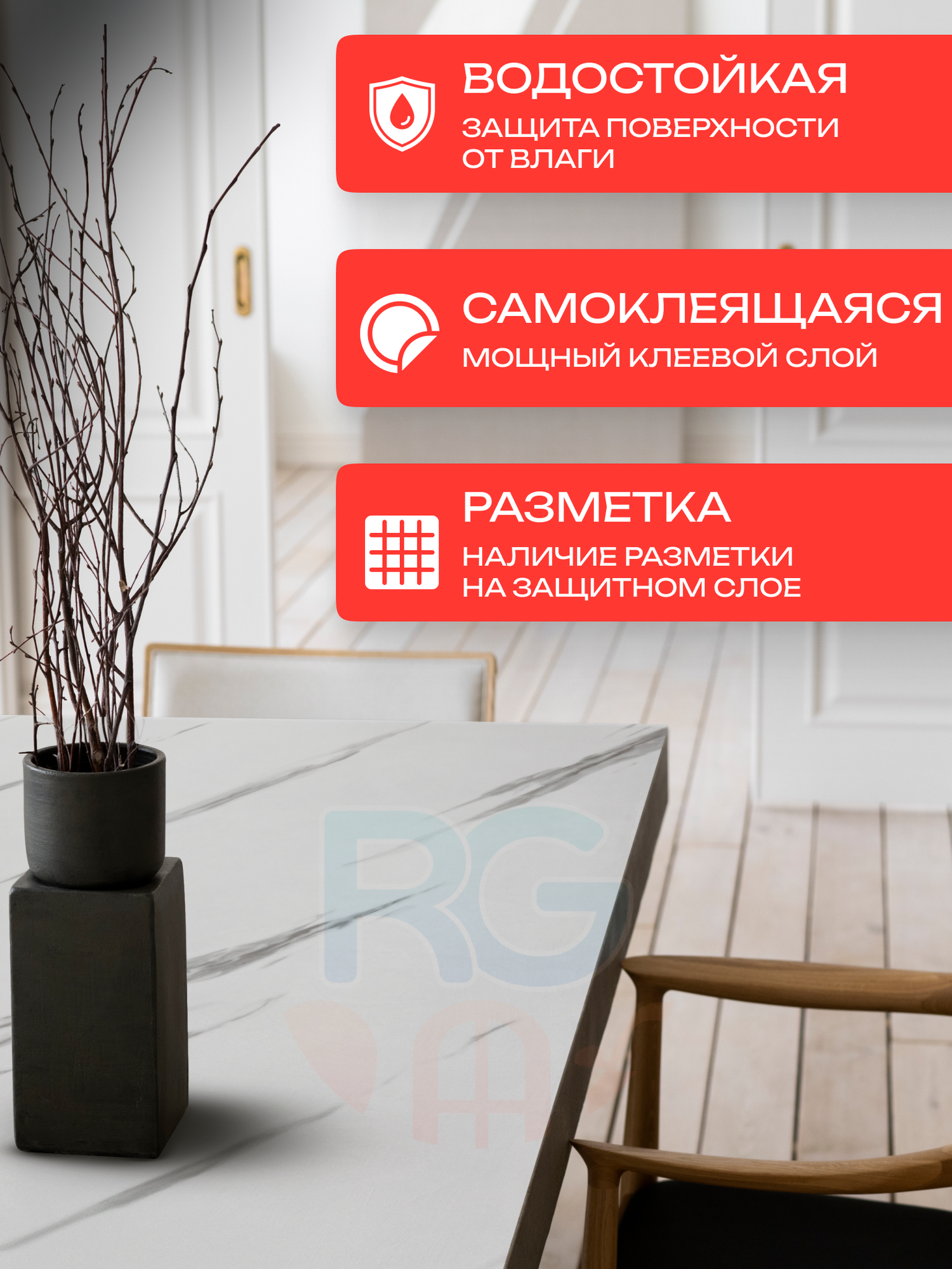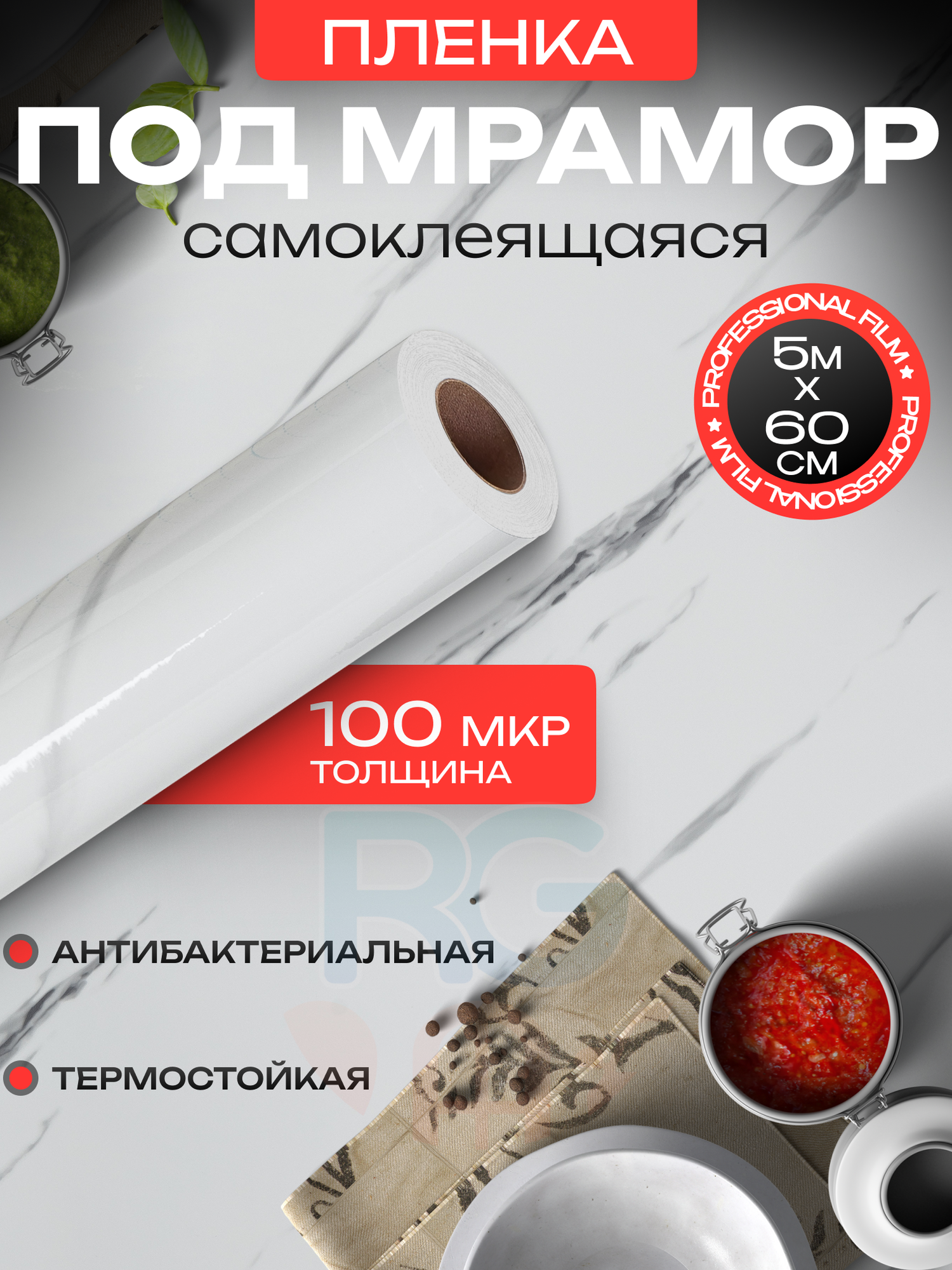 Пленка самоклеющаяся для кухни Reton Group, 30х60 см, белая, мраморная, глянцевая. самоклеющаяся пленка для мебели