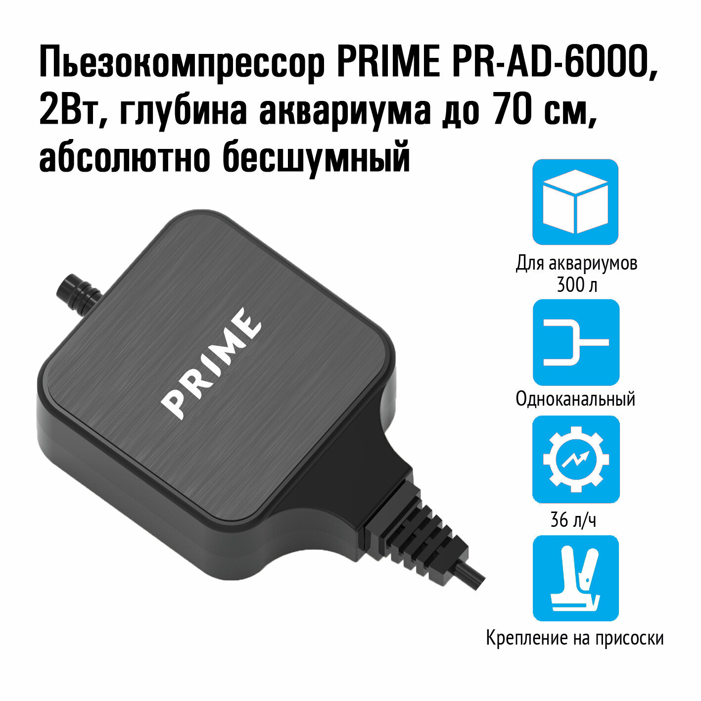 Пьезокомпрессор PRIME PR-AD-6000, 2Вт, 36 л/ч, глубина аквариума до 70см, абсолютно бесшумный