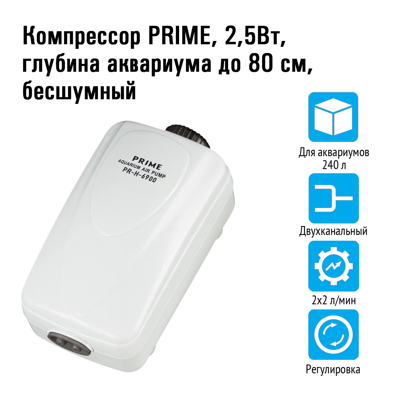 Компрессор PRIME PR-H-6900 двухканальный регулируемый, 2,5 Вт, 2 х 2 л/мин, для аквариумов глубиной до 80 см, бесшумный (1 шт)