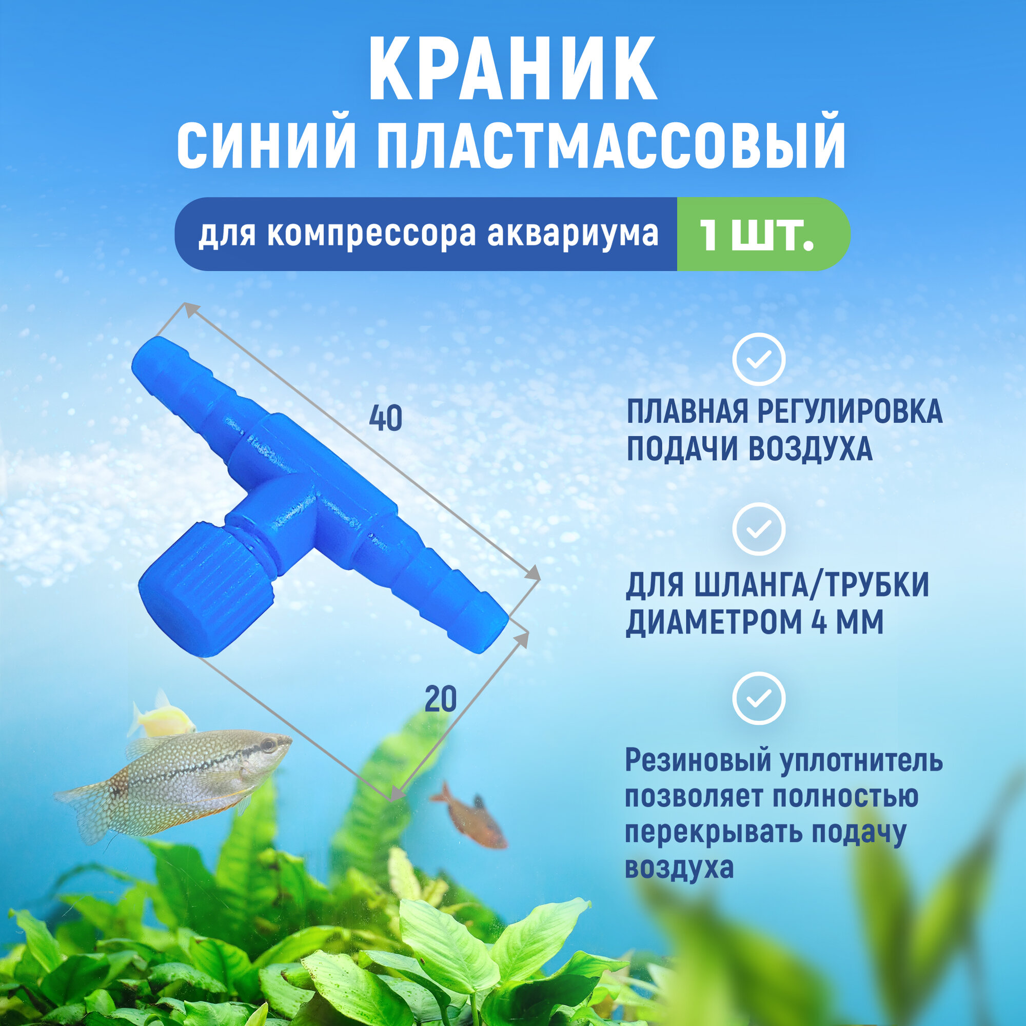 | Дополнительная информация | Краник синий пластмассовый для компрессора аквариума с плавной регулировкой |