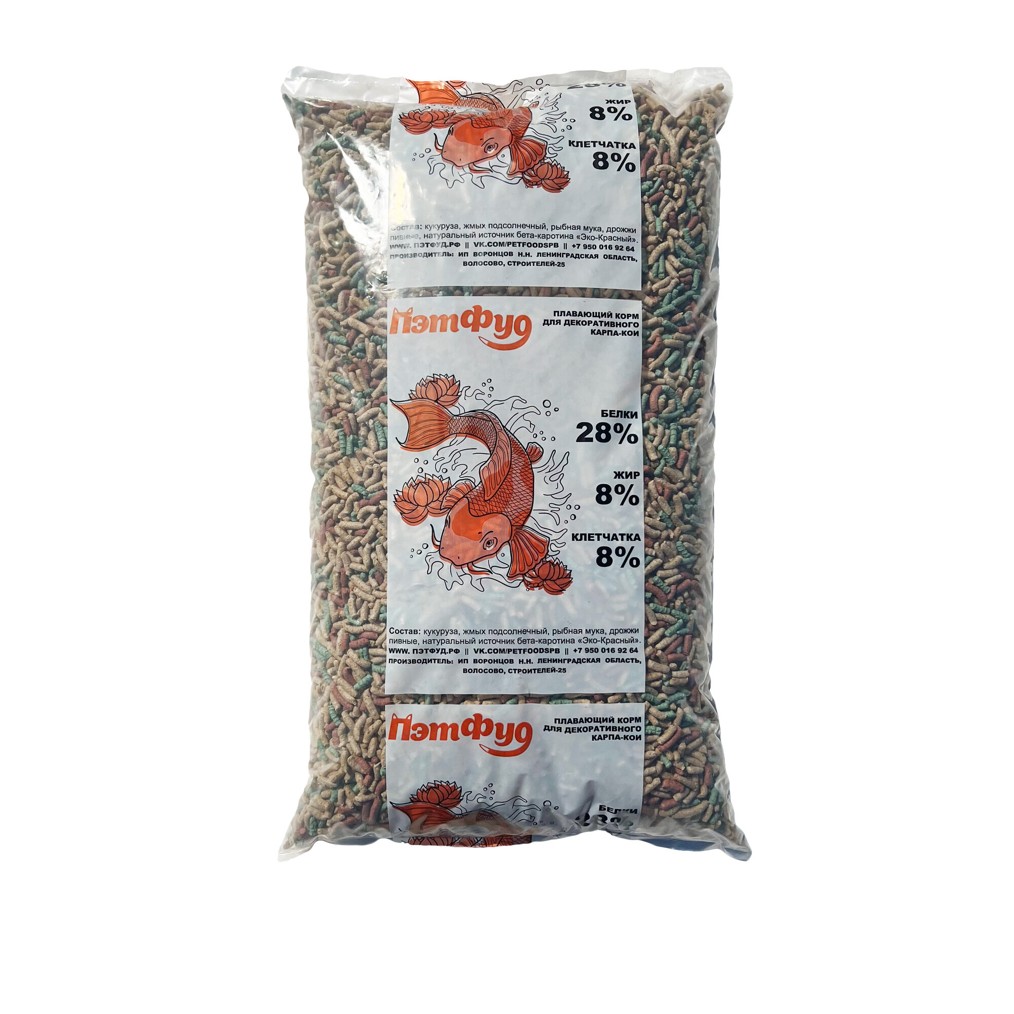 | Ингредиенты | Состав: кукуруза, жмых подсолнечный, рыбная мука, дрожжи пивные, нат. источник бета-каротина «Эко-Красный». Аналитический состав: Протеин: 28%; Жир: 8%; Клетчатка: 8% |