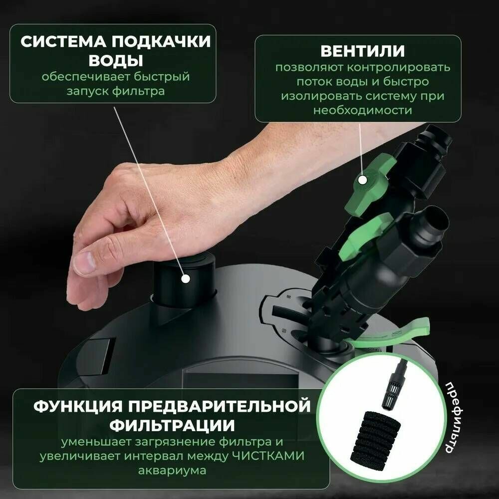 | Дополнительная информация | У Tetratec EX 700 plus встроена кнопка для подкачки воды при запуске фильтра, для заполнения его водой. В зависимости от уровня загрязнения и степени износа фильтрующие наполнители меняются каждые 6–12 месяцев. |