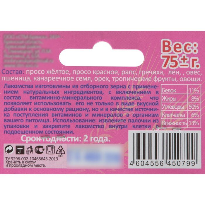 Палочки Seven Seeds Эконом для птиц, овощи/тропические фрукты/орех, 3 шт, 75 г интересное:
